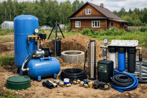 Ключевые категории оборудования, которые рассматриваются дальше: скважинные и поверхностные насосы, насосные станции «всё в одном», накопительные баки и гидроаккумуляторы, системы фильтрации и обезжелезивания, разводка труб и запорная арматура, автоматика и системы повышения давления. Примерные ориентиры цен (приблизительно и с учётом регионального рынка): скважинные погружные насосы — от ~15 000 до 80 000+ руб.; насосные станции и поверхностные насосы — от ~8 000 до 40 000 руб.; гидроаккумуляторы — от ~3 000 до 25 000 руб.; базовые фильтры и умягчители — от ~5 000 до 40 000 руб.; полипропиленовые или ПНД трубы и фитинги — от нескольких сотен до нескольких тысяч рублей за погонный метр в зависимости от диаметра и материала; работы по бурению и монтажу могут стоить от десятков до сотен тысяч рублей в зависимости от глубины скважины и сложности.