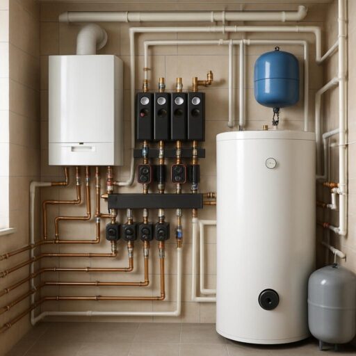 Ключевые элементы системы работают в связке. Модулирующий котёл поддерживает заданную температуру плавно, без частых включений. Буферные ёмкости и гидравлические разделители сглаживают пиковые нагрузки.