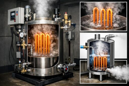 ТЭНовый парогенератор превращает воду в пар посредством погружных нагревательных элементов.