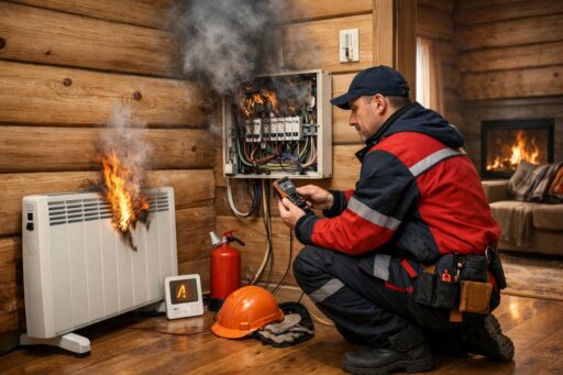 Негерметичные соединения, скрытая проводка и близкое расположение обогревателей к стенам усиливают опасность. Усадка бруса способна смещать кабели и ослаблять контакты. Влажность в межсезонье меняет тепловой режим и влияет на долговечность изоляции.