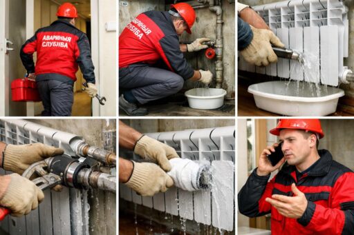 Пока ожидаете прибытия аварийной службы, постарайтесь ограничить ущерб: подставьте ёмкости под течь, защитите мебель и электронику, проложите тряпки для направления струи к сливу. Небольшие временные закрутки можно выполнить при наличии подходящих инструментов и навыков, но не предпринимайте рискованных самостоятельных сварочных или резьбонарезных работ на действующей системе.