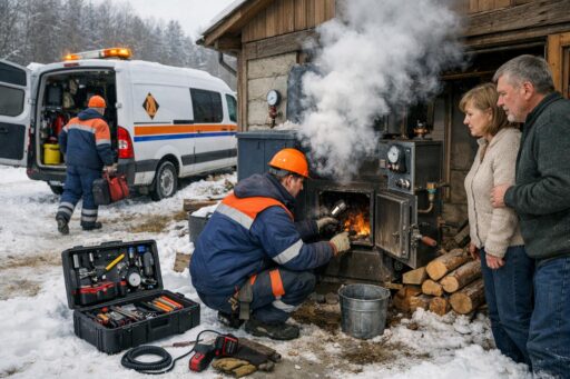 При первых признаках неполадки нужно принять простые меры безопасности: прекратить подкладывать дрова при подозрении на неправильную тягу, проветрить помещение при задымлении или срабатывании угарного газа, не использовать оборудование, если есть течь теплоносителя или сильный запах гари. Одновременно следует обратиться в аварийную службу отопления или к квалифицированному печнику: специалисты оценят состояние дымохода, работы горелки и циркуляции, устранят неисправности и восстановят безопасный режим работы.