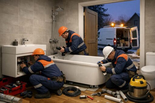 Типовая экстренная работа включает оперативную оценку состояния коммуникаций, разработку практичного и безопасного варианта размещения ванной комнаты, монтаж сантехники и подключение водопровода, канализации и электрики, а также герметизацию и проверку системы на работоспособность. Для ускорения процесса используются готовые модульные решения и проверенные материалы, что позволяет свести к минимуму демонтажные и строительные работы при соблюдении всех норм и стандартов.