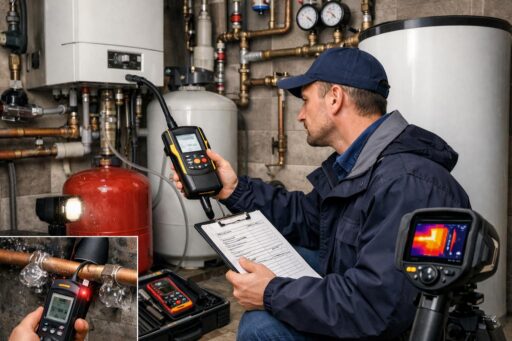 Диагностика проводится с применением как простых приемов (визуальная оценка, контроль параметров на приборных панелях), так и профессиональных инструментов — анализатора дымовых газов, манометров, тестеров электроцепей, устройств для контроля протечек и коррозии. Такой подход позволяет выявлять не только явные неисправности, но и скрытые факторы, снижающие КПД и сокращающие срок службы оборудования.