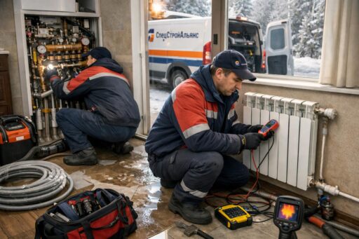 Бригада выезжает с набором запчастей и средств временной герметизации. На месте мастера выполняют быстрый осмотр, определяют источник неисправности и при необходимости перекрывают участки системы. Цель — вернуть отопление хотя бы в минимальном режиме. Это снижает риск повреждения отделки и техники.