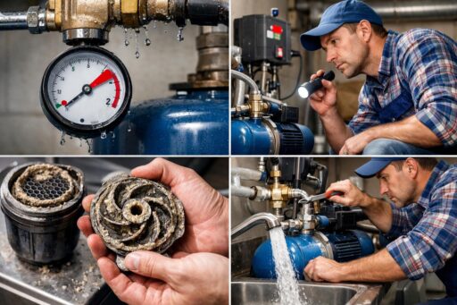 Наиболее распространённые источники проблем — утечки в трубопроводе, засорённые или отложившиеся фильтры и сетки, частичное или полное засорение труб и обратных клапанов, снижение уровня воды в источнике, износ или неправильная наладка погружного или поверхностного насоса, неисправности реле давления и мембраны гидроаккумулятора. Электрические пробои, наличные воздушные пробки и неверные настройки трубопроводной арматуры также регулярно обостряют падение напора.