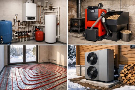 Основные варианты систем отопления и их преимущества: газовый конденсационный котёл — доступность топлива и невысокие операционные затраты при наличии магистрального газа; тепловой насос (воздух‑вода или геотермальный) — высокая энергоэффективность и низкие эксплуатационные расходы при правильном подборе и хорошем утеплении; электрические котлы и ИК‑панели — простота монтажа, высокая стоимость электроэнергии делает их реальным вариантом при дешёвых ночных тарифах или как резерв; твердотопливные и пеллетные котлы — независимость от магистрали, требует обслуживания и места для топлива; комбинированные схемы с буферной ёмкостью и резервным котлом дают надёжность и гибкость.