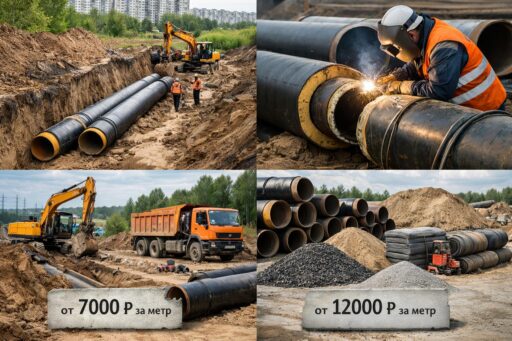 Стоимость работ формируется из множества составляющих: проектно‑разрешительной документации, цены материалов (трубы с изоляцией или без, фитинги, арматура), объёма земляных работ и типа траншеи (открытая, в проколе, в гнезде), уровня подготовки основания, глубины заложения, сложных переездов через дороги и инженерные коммуникации, затрат на восстановление покрытия, испытаний и пусконаладочных работ, а также оплаты труда подрядчиков и логистики. На итоговую сумму влияют местные условия — геология участка, уровень грунтовых вод и требования муниципальных служб.