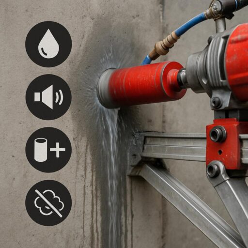 Мокрое алмазное бурение является инновационной технологией, объединяющей высокую эффективность и безопасность. Использование воды для охлаждения и удаления пыли делает процесс не только точным, но и экологически ответственным.