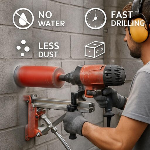 Сухое алмазное бурение отличается высокой скоростью выполнения работ. Благодаря отсутствию необходимости использовать воду, процесс становится мобильнее и удобнее, особенно в условиях, где подача жидкости затруднена или невозможна. Такой метод значительно снижает время подготовки и очистки рабочего места.