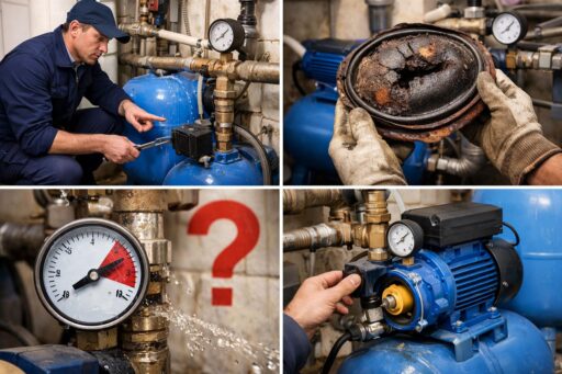 Признаки конкретных неисправностей легко заметить при осмотре. Усиленная вибрация и шум говорят о разрушении рабочего колеса. Рост потребляемой мощности указывает на засор или тяжёлую подачу. Частые включения и отключения свидетельствуют о проблемах с мембраной или контроллером давления. Нестабильный поток может означать подсос воздуха на всасывании.