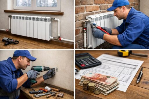 На итоговую цену влияют тип радиаторов (чугунные секционные, алюминиевые, биметаллические), количество секций и приборов, сложность трассировки трубопровода, необходимость замены магистральных стояков или установки нового котла, способ монтажа (вертикальный/горизонтальный, скрытая разводка), подготовительные работы и согласования. Дополнительные расходы дают запорная арматура, терморегуляторы, кронштейны, гидравлические испытания и балансировка системы.