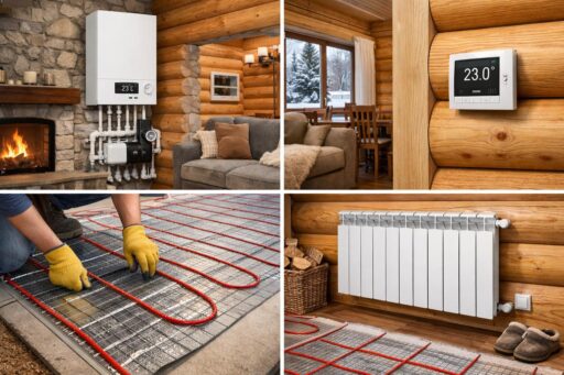 Тёплые полы дают равномерный комфорт и экономят при правильной укладке. Для брусового дома лучше выбирать тонкие сухие системы. Они уменьшают нагрузку на перекрытия и ускоряют монтаж. Типичные плотности мощности: ванная 120–150 Вт/м², гостиная и спальня 80–120 Вт/м².