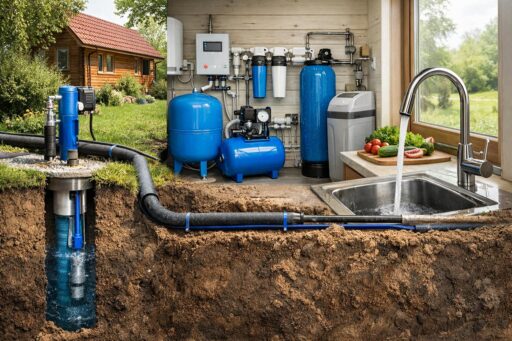 Ключевые компоненты индивидуальной системы — корпус скважины с обсадной колонной, погружной насос или комплект с гидроаккумулятором, система автоматики давления, магистральные трубы до дома, накопительный бак и блок очистки, включающий механические фильтры, реагентные или адсорбционные модули и, при необходимости, обеззараживание. Правильный подбор и согласованная установка этих элементов определяют долговечность системы, экономичность и безопасность воды для бытовых нужд.