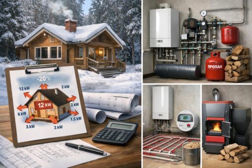 Система распределения тепла: традиционные радиаторы дают более низкую инерцию и простоту монтажа, тёплый пол обеспечивает комфорт и равномерный прогрев при более высокой стоимости устройства и более низкой рабочей температуре теплоносителя. Часто разумно комбинировать: тёплый пол в жилых зонах и радиаторы в зонах с большими оконными проёмами или высокой тепловой потерей.