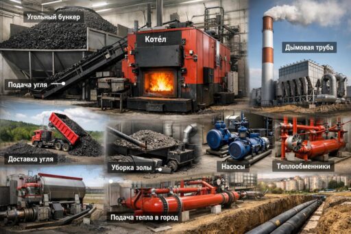 В основе котельной — подача топлива, сжигание и передача тепла в сеть. Уголь доставляют и складируют на площадке, затем подают в топку котла, где при высокой температуре происходит горение. Теплоноситель (вода или пар) нагревается в котле, проходит через теплообменные поверхности и далее по трубопроводам поступает в дома и социальные объекты.