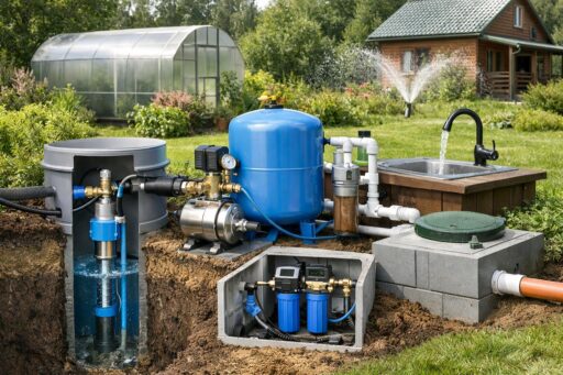 Проверенные решения для дачного водоснабжения обычно включают несколько базовых вариантов: подключение к центральной водопроводной сети (при наличии), бурение скважины или устройство колодца, установка накопительных емкостей с насосом и автоматикой, а также использование систем фильтрации и дезинфекции. Комбинация методов — например, скважина плюс накопительный бак и автоматическая насосная станция — обеспечивает стабильность подачи и резервирование в периоды перебоев.