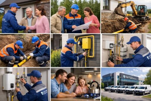 Компания оказывает полный спектр работ по подключению газа. В перечень услуг входят подготовка документов, проектирование, земляные работы, монтаж наружных и внутридомовых сетей, опрессовка и ввод в эксплуатацию. Также доступно гарантийное и постгарантийное обслуживание.
