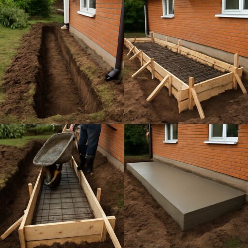 Дальше в статье мы подробно пройдём каждый этап: подготовка и разметка участка, земляные работы, устройство опалубки и армирование, бетонирование и уход за свежим бетоном, защита и обратная засыпка — с пошаговыми фотографиями и практическими советами для типичных ситуаций.