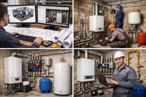 Работа начинается с замеров и анализа здания по шагам. Далее выполняются расчёты потерь по ограждающим конструкциям и учёт теплопоступлений. После этого выбирают мощность оборудования с учётом запаса и реальных условий. Параллельно проверяют циркуляцию и гидравлические параметры системы.