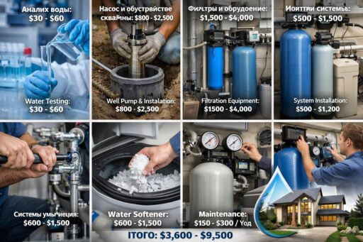 Оборудование дорожает при повышенных требованиях к качеству воды и при выборе брендовых решений. Монтаж подорожает при сложной разводке труб и работах в стеснённых условиях. Лабораторные исследования и повторные пробы увеличивают бюджет при нестабильном источнике. Расходники и соль для умягчителей формируют постоянную эксплуатационную статью расходов.