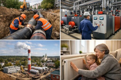 Технологические решения варьируются от реконструкции магистральных и внутридомовых трубопроводов с применением современных теплоизоляционных материалов до замены устаревших котельных на конденсационные установки, тепловые насосы или когенерационные блоки. Важной частью становятся автоматизированные системы диспетчеризации, цифровые приборы учета и управление температурными графиками по погодозависимому принципу — это сокращает потери и оптимизирует расходы топлива.
