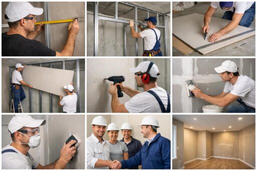 На этапе монтажа выполняем подготовительные работы и установку каркаса. Крепеж рассчитываем с учётом расстояний и эксплуатационных требований. Монтируем листы, усиливаем углы и прослойки из изоляции. Организуем уборку пыли и вывоз строительного мусора ежедневно.
