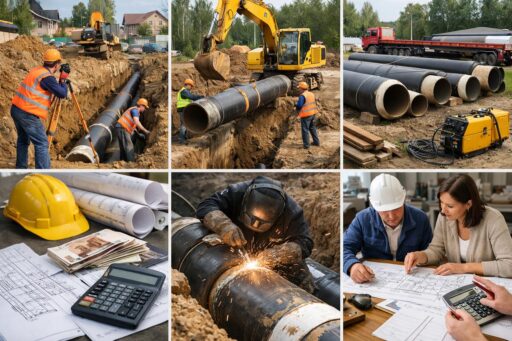 Прокладка и подключения включают сварку, сборку арматуры и испытания. Качество сварных швов определяет срок службы магистрали. Дополнительные расходы возникают при установке тепловых колодцев. Стоимость монтажных работ обычно оценивают в рублях за метр.