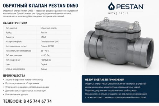 Обратный клапан Pestan DN50 представляет собой компактное устройство для защиты трубопровода. DN50 означает номинальный диаметр 50 миллиметров. Клапан предотвращает обратный поток и защищает насосное оборудование. Его применение снижает риск гидроударов и аварийных сливов.