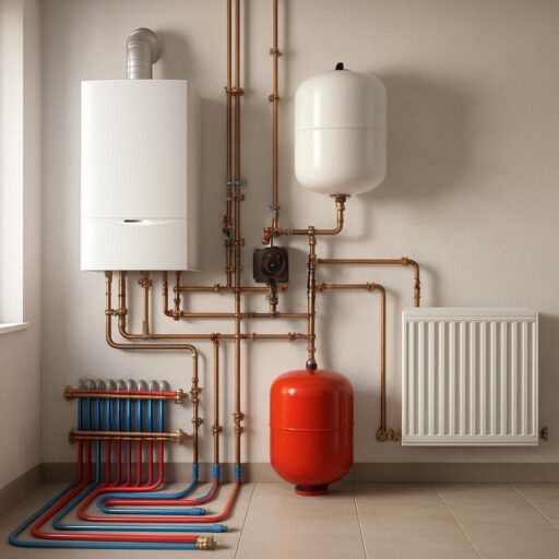 Ключевые элементы системы — котел (газовый, электрический, твердотопливный, пеллетный или тепловой насос), циркуляционный насос, расширительный бак, группа безопасности (предохранительный клапан, манометр), коллектора и байпасы для зонального распределения, радиаторы или контуры теплого пола, трубы и арматура. Правильный подбор каждого компонента напрямую влияет на надежность и экономичность системы.