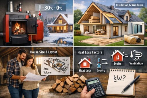 На итоговую потребную мощность влияют в первую очередь: объём помещения (площадь и высота потолков), степень теплоизоляции ограждающих конструкций, материал и толщина стен, количество и качество окон и дверей, климатический расчётная температура региона, интенсивность вентиляции и инфильтрации воздуха, планировка и наличие внутренних перегородок. Также важны особенности системы отопления (радиаторы или тёплый пол), наличие буферной ёмкости, требуемая температура отопления и потребность в горячей воде, а также КПД и особенности работы самого дровяного котла (тип топки, режим загрузки, порода и влажность дров).