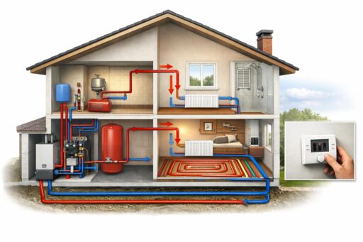 Водяное отопление остаётся оптимальным для больших домов с постоянным проживанием. Оно даёт равномерный, мягкий теплоотдающий эффект. Комбинируется с различными источниками энергии, включая тепловые насосы. Монтаж сложнее, но эксплуатация часто экономичнее при разумной схеме. Радиаторы или тёплые полы улучшают качество микроклимата.