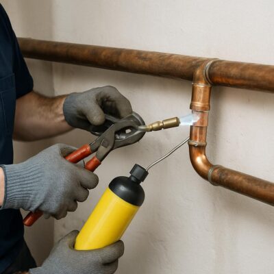 Не менее важны профессиональные инструменты, без которых невозможно обеспечить аккуратность и качество ремонта. К ним относятся труборезы, обеспечивающие ровный и чистый срез трубы без деформаций, а также специальные щетки и скребки для очистки поверхности меди перед пайкой. Газовые горелки с регулируемым пламенем позволяют точно контролировать процесс нагрева, что существенно снижает риск перегрева и повреждения материала.