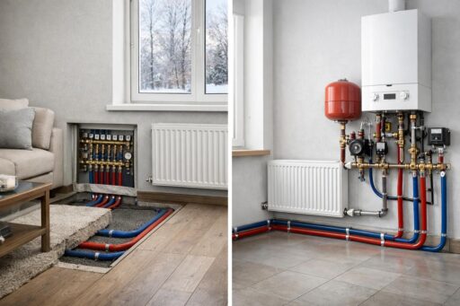 Скрытый монтаж лучше вписывается в современный интерьер. Трубы прячутся в полу и стенах. Такой вариант подойдет при капитальном ремонте или для новых домов. Открытый монтаж оправдан в технических помещениях и старых постройках. Он упрощает замену участков и снижает стоимость работ.