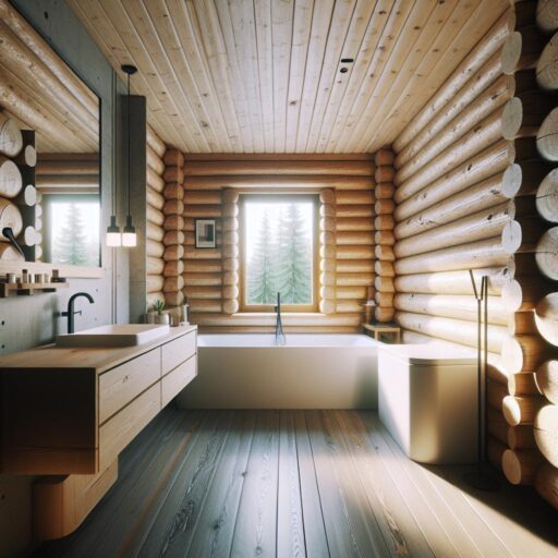 Кроме того, популярны ванные комнаты, выполненные в стиле скандинавского минимализма с преобладанием светлых оттенков и продуманным использованием пространства. Применение матовых фактур и мягких текстур мягко контрастирует с деревянными стенами, подчеркивая их естественную красоту без излишней яркости.
