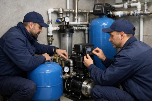 Специалисты настраивают основное оборудование частного водоснабжения. Организация автономного водоснабжения частного дома — задача, требующая не только выбора качественного оборудования, но и его правильной настройки. От корректной установки насосов, систем фильтрации, накопительных баков и автоматики напрямую зависят стабильность подачи воды, её качество и срок службы всех компонентов системы.