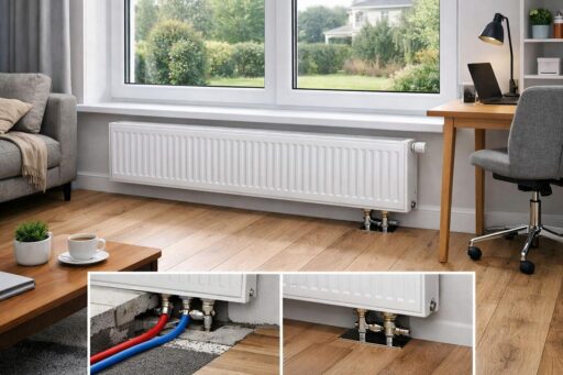Ключевые преимущества такого решения — аккуратный интерьер за счёт незаметных трубопроводов, удобство установки при расположении стояков и коллекторов в полу, а также простота подключения при замене или модернизации отопительной сети. Стальные панели дают быстрый выход на рабочую температуру и равномерное распределение тепла, что повышает комфорт и экономит энергию.