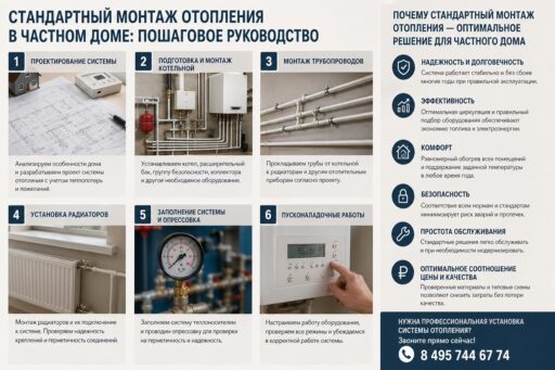 Стандартный монтаж отопления экономит время и снижает риск ошибок при монтаже. Типовые решения опираются на проверенные схемы и согласованные нормы.