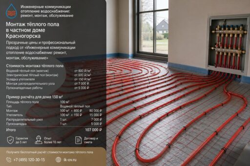 Сколько стоит монтаж тёплого пола в частном доме Красногорска: прозрачные цены от «Инженерные коммуникации отопление водоснабжение: ремонт, монтаж, обслуживание»