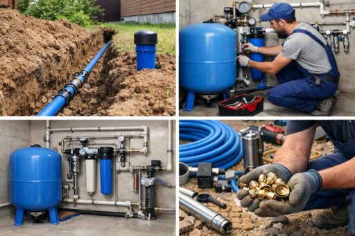 Примерные расценки по типовым задачам (ориентировочно): подключение к центральному водопроводу при близкой сетке и простой точке врезки — от 20 000 до 120 000 руб.; прокладка наружного водопровода и траншеи — порядка 300–1 500 руб/м за работы (без учёта материалов); бурение скважины под питьевую воду — в среднем 40 000–200 000 руб. в зависимости от глубины и геологии; установка насосной станции (поверхностный насос) — 10 000–40 000 руб., погружной насос — 20 000–80 000 руб., автоматизированные станции с гидроаккумулятором и автоматикой — 40 000–150 000 руб.; системы очистки и фильтрации — от 8 000 руб. за базовый фильтр до 100 000 руб. и выше за комплексные установки.