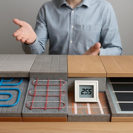 Кухня и прихожая выгоднее с кабельными или матовыми электросистемами. Под плитку кабельная укладка даёт стабильный тёплый слой. Для зон с высокой проходимостью выбирайте прочное основание и температурный контроль. Если планируется подключение к общему отоплению, водяной контур тоже оправдан.