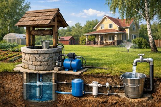 Водоснабжение из колодца: устройство и монтаж слива системы в доме. Водоснабжение из колодца — популярное и экономичное решение для загородного дома, но его надежность и долговечность зависят от правильного устройства и грамотного монтажа всех элементов системы. От качества подключения насоса, прокладки труб и установки фильтров зависит не только комфорт, но и сохранность оборудования в холодное