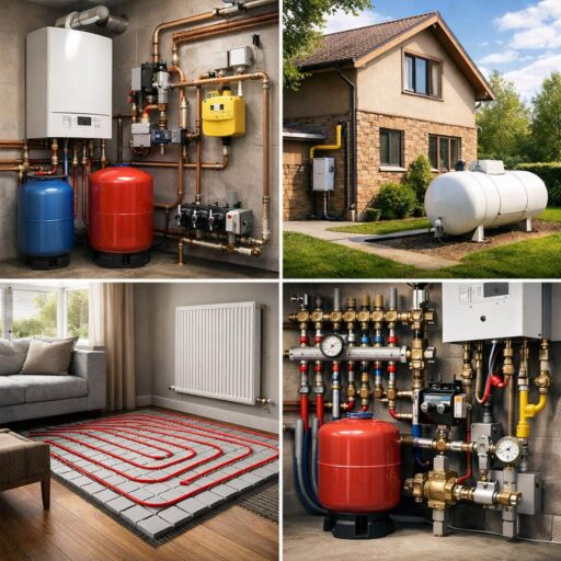 В основе системы — газовый котел (обычный или конденсационный), циркуляционный насос, расширительный бак, трубопровод, радиаторы или контуры теплого пола, а также автоматика безопасности и программируемые термостаты. Современный стандарт — закрытая система с принудительной циркуляцией: она работает тихо, стабильно и не боится сложной разводки труб или многоэтажной планировки.